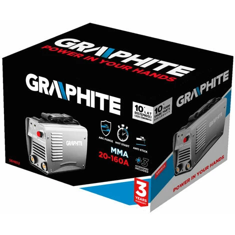 Die Schweißmaschine mit Inverter der Marke GRAPHITE ist das perfekte Gerät zur Durchführung von Schweißarbeiten. Die Anwendung von bipolaren Hochleistungstransistoren garantiert eine effiziente Arbeit des Gerätes und eine präzise Schweißstromsteuerung. Die Hot-Start-Funktion erleichtert die Zündung des Lichtbogens und den Start des Schweißprozesses. Die automatische Luftkühlung sichert einen langen und störungsfreien Einsatz. Der bequeme Griff erleichtert den Transport.