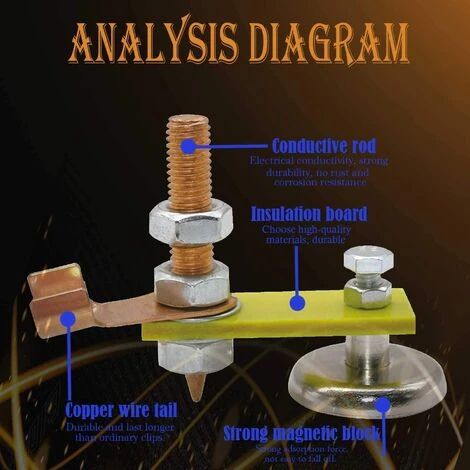 Das Paket enthält 1 Magnetfuß, 1 Isolierplatte, 4 leitfähige Stangen, 5 Drahtklemmen, 2 Unterlegscheiben, 3 große Schraubringe, 1 kleinen Schraubring und 1 kleine Schraube.