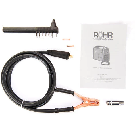 Wenn Sie ein Schweißgerät von Röhr kaufen, erhalten Sie eine Vielzahl an Zubehör für Ihre Schweißarbeiten. Dieses Schweißgerät wird mit einer Schweißmaske, einer Reinigungsbürste, 3 Spannhülsen (2 x 0,8 mm, 1 x 0,6 mm), 2 Düsen aus Stahl und einer Tasche für das Zubehör geliefert. Das Gerät hat ein 2 m langes Netzkabel, damit Sie es zum Schweißen an einem geeigneten Platz aufstellen können.