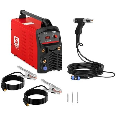 Der stufenlos einstellbare Spannungsregler besitzt Markierungen, mit denen die optimale Spannung für verschiedene Bolzengrößen zwischen M3 und M8 eingestellt wird. Je nach verwendeter Metallart kann die Spannung entsprechend Ihrer persönlichen Erfahrungswerte stufenlos erhöht oder reduziert werden. Zwei Massekabel verbessern die Leitfähigkeit und erhöhen den Schutz vor einem Kurzschluss.