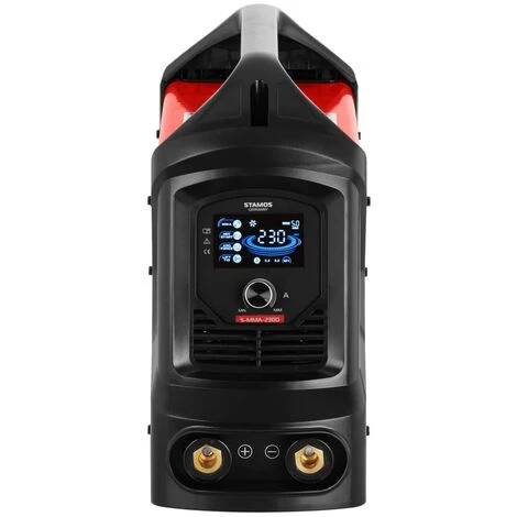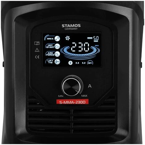 Das Elektroden Schweißgerät S-MMA-230D von Stamos Germany mit IGBT-Inverter-Technologie und LCD-Display verbindet Leistungswerte bis 160 A mit kompakter Bauweise. Für eine Einschaltdauer von 100 % wird der Schweißstrom auf 115 A reguliert. Die Hot-Start-Funktion des Elektroden-Schweißgerätes gewährleistet beim Start des Schweißvorgangs automatisch und
