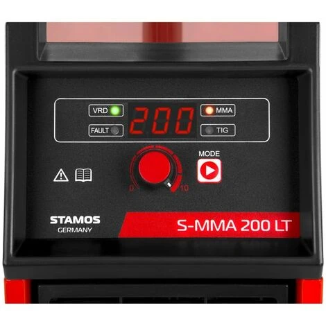 Die Bedienung des Schweißgeräts erfolgt über ein digitales Menü mit großem LED-Display, wozu auch das Potentiometer zur stufenlosen Regulierung des Schweißstroms zwischen 10 und 200 Ampere gehört. Mit den übersichtlich angeordneten Tasten können Sie einfach zwischen MMA-Schweißen und WIG-Schweißen wechseln und die Sicherheitsfunktion VRD hinzuwählen.