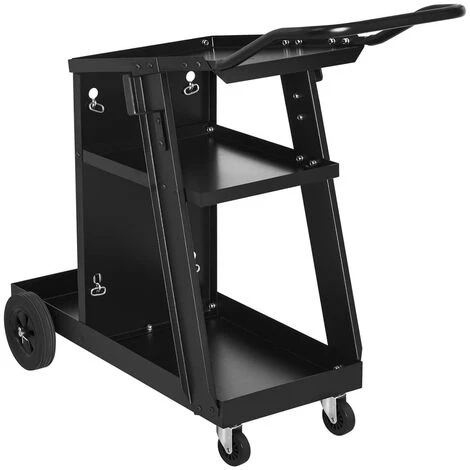 Drei Ablageflächen bieten sehr viel Platz für Ihre ganze Ausrüstung bzw. Ihr Schweißzubehör. Die oberste Ablagefläche ist leicht angewinkelt und bietet einen Stellplatz von 45 x 31 cm für größere Gegenstände. Kleines Zubehör findet auf dem mittleren Bord Platz, wofür eine Fläche von 38,8 x 28,8 cm zur Verfügung steht. Praktisch sind darüber hinaus die Bügel an beiden Seiten, an denen Sie Kabel und Schläuche verwahren können.