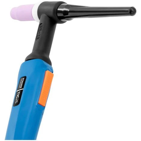 Ob Gleichstrom oder Wechselstrom, mit dem WIG-Schweißbrenner von Stamos Germany erhalten Sie effektive Leistungswerte für Ihr WIG-Schweißgerät. Der WIG-Brenner ist für Stromstärken bis 180 A DC bzw. 150 A AC ausgelegt und überzeugt mit einer Einschaltdauer von 35 %. Die Nennspannung des Brenners liegt bei 113 V. Damit können Sie effektiv die meisten Schweißarbeiten ausführen und optimale Schweißnähte erzielen. Der WIG-Brenner liegt sicher in der Hand, wobei das Schutzgehäuse selbst für robuste Arbeiten geeignet ist. Mit einem Gasdurchfluss von 8 l/min wird der Brenner zuverlässig gekühlt und erzeugt einen stabilen Lichtbogen, der optimale Schweißnähte gewährleistet. Verbinden Sie das 8 m lange Schlauchpaket des WIG-Brenners mit dem 2-Pin-Anschluss an Ihr Schweißgerät. Ausgestattet ist er mit einer 35 – 50 Schnellkupplung sowie einer Gasschnittstelle mit einem Anschlussgewinde von M16x1,5. Zum Schweißen können Wolframelektroden mit einem Durchmesser von bis zu 2,4 mm verwendet werden. Im Lieferumfang finden Sie 4 Gasdüsen, 2 Spannhülsen, 1 Spannhülsengehäuse sowie eine kurze und lange Brennerkappe.