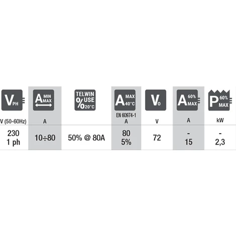 | Einschaltdauer (lt. Telwin bei 20°C): | 45% @ 80 A |