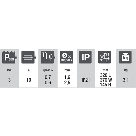 | Verwendbare Stabelektroden: | 1,6 – 2,5 mm |