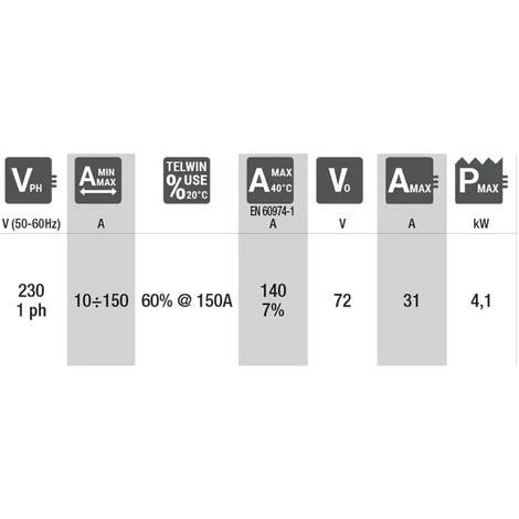 | Einschaltdauer (Telwin-Angabe bei 20°C): | 60% @ 150 A |