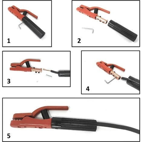 Der Elektrodenhalter besteht aus hochwertigem Kupfer mit hoher Leitfähigkeit und kann Elektroden mit einem Durchmesser von bis zu 5 mm aufnehmen.